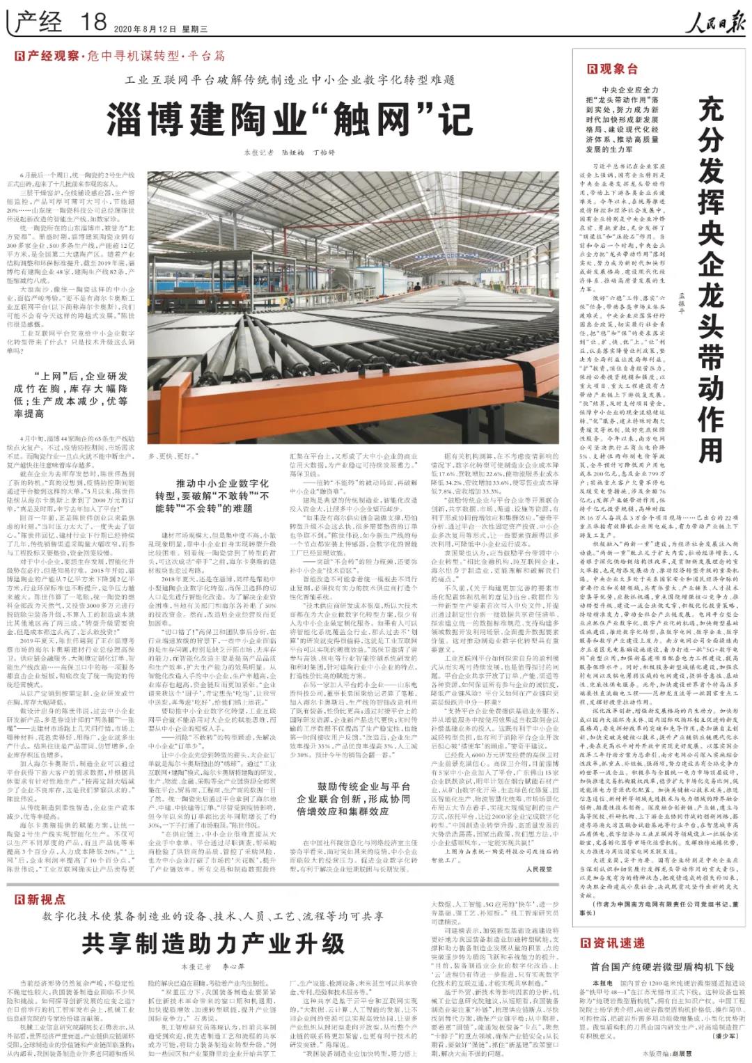 8月12日,人民日报报道“电盾科技”通过海尔卡奥斯平台实现生产线的智能化升级改造,由大规模制造向大规模定制转型,开启“工业互联网+建陶”模式!